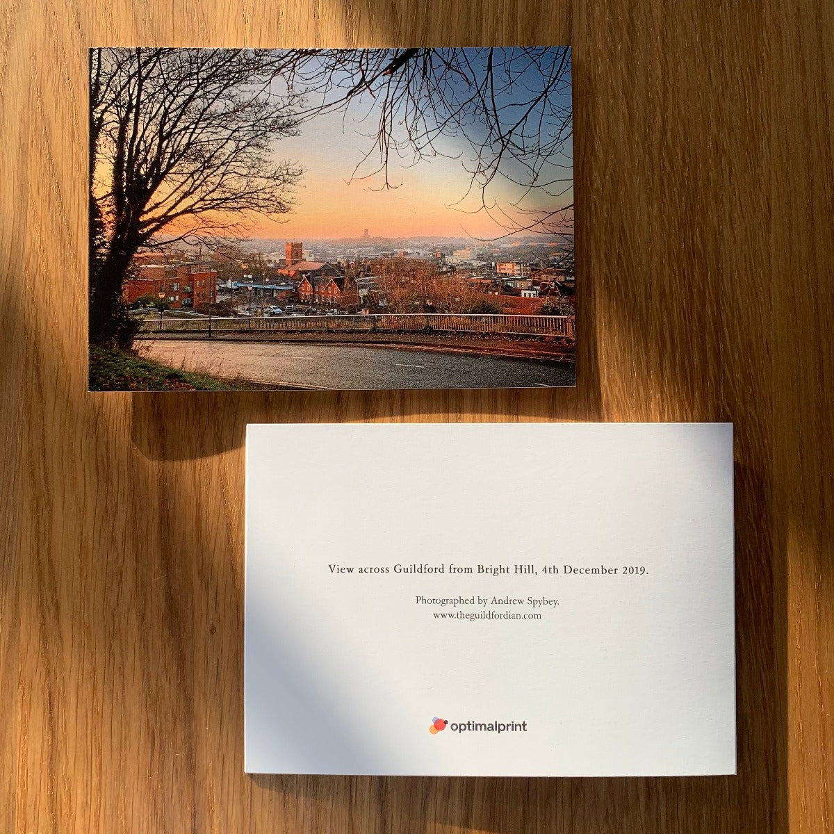 On the rear of the card is the caption View across Guildford from Bright Hill, 4th December 2019. Photographed by Andrew Spybey. www.theguildfordian.com. The printer's logomark is found below.